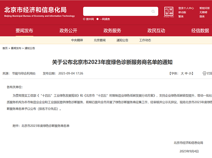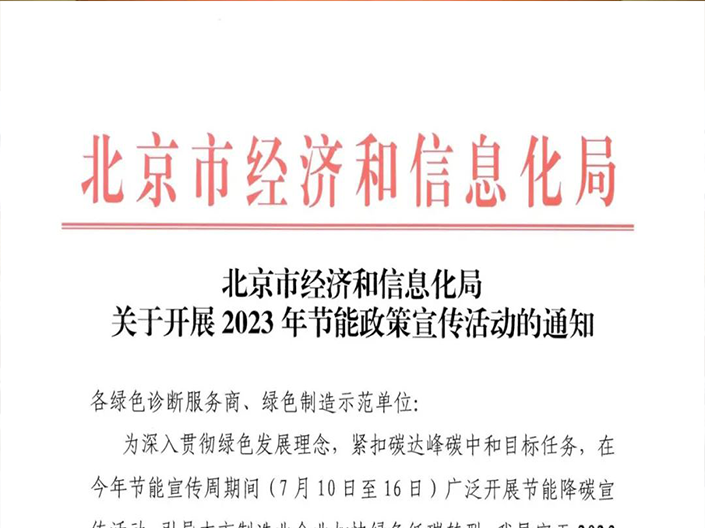 2023年9月4日,北京市經(jīng)濟(jì)和信息化局發(fā)布了《北京市經(jīng)濟(jì)和信息化局關(guān)于組織開展2023年度綠色診斷工作的通知》。經(jīng)審核,我司成功入圍北京市綠色診斷服務(wù)商,為在京規(guī)模以上制造業(yè)企業(yè)、工業(yè)園區(qū)及開發(fā)區(qū)提供綠色診斷...