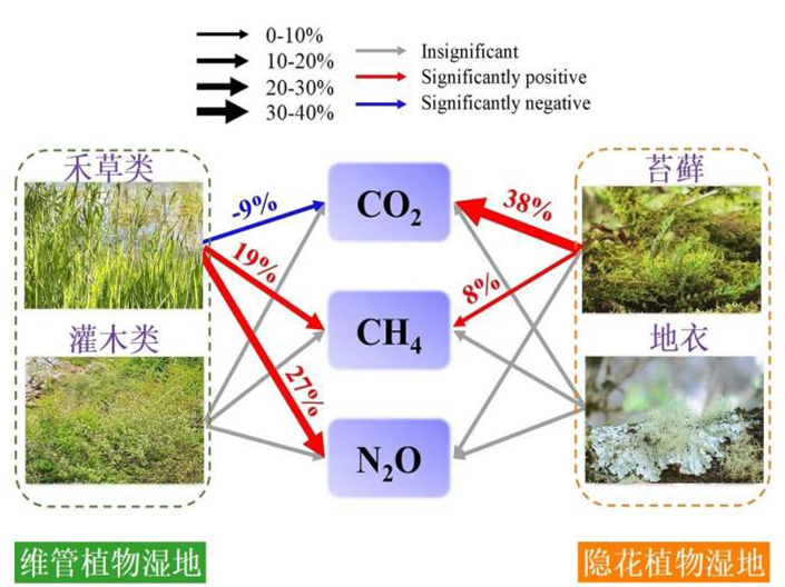 不同優(yōu)勢(shì)植物功能群濕地,二氧化碳、甲烷和氧化亞氮三種溫室氣體凈交換對(duì)增溫的響應(yīng)。 中科院大氣所 供圖 中新網(wǎng)北京3月21日電 (記者 孫自法)全球增溫對(duì)濕地的溫室氣體“匯”(簡稱碳匯)功能有沒有影響?有何影...
