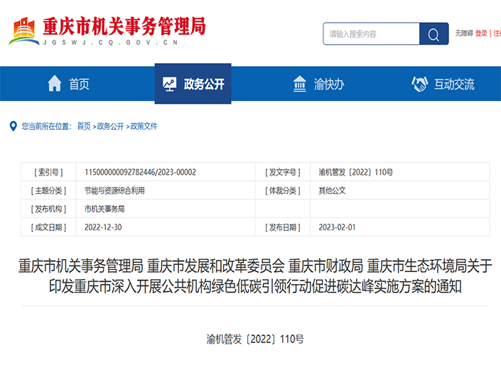 近日日,重慶市公布《重慶市深入開展公共機構(gòu)綠色低碳引領(lǐng)行動促進碳達峰實施方案》,文件中提出,對標(biāo)碳達峰目標(biāo)和碳中和愿景,實現(xiàn)綠色低碳引領(lǐng)行動推進有力,干部職工生活方式綠色低碳轉(zhuǎn)型成效顯著,在全社會綠色...