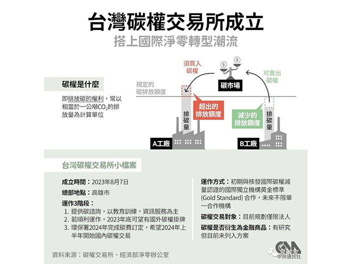 臺灣碳權(quán)交易所7日成立,島內(nèi)碳權(quán)交易將在明年上半年上路(CNA制圖)臺灣省碳權(quán)交易所已于8月成立,但碳權(quán)交易的辦法仍在研議;臺灣省環(huán)境部門表示,有機(jī)會在今年10月前后預(yù)告,如國外碳權(quán)在臺灣省內(nèi)適用的比例、是...
