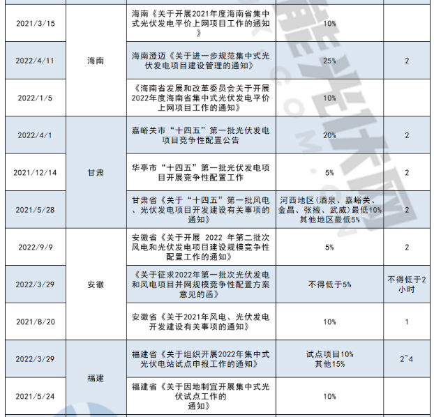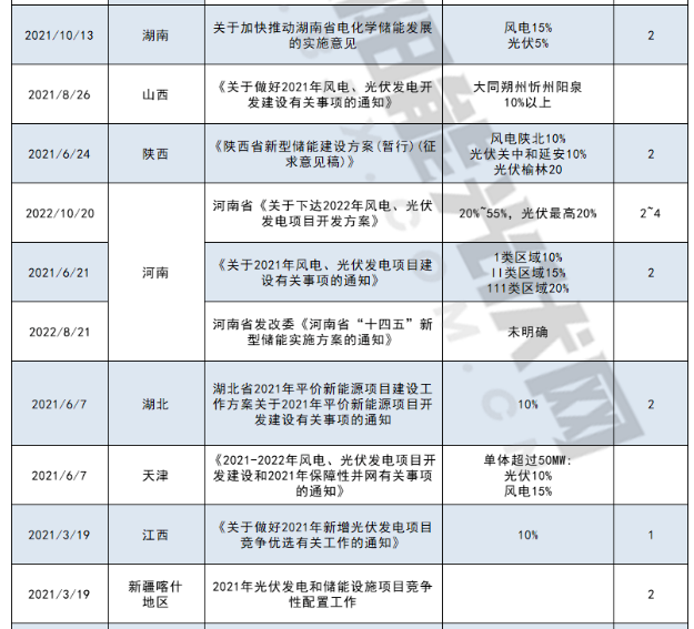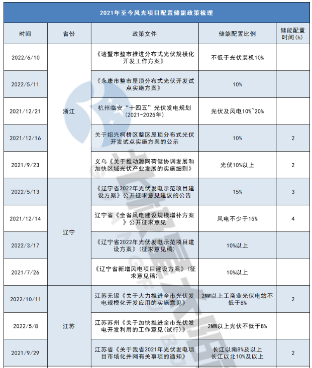 2021年至今各省風(fēng)光項目配儲詳情見下表: