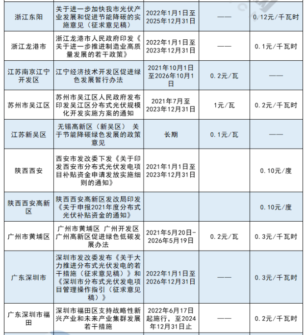 二、光伏補貼截至目前,據(jù)不完全統(tǒng)計,我國仍有57個地方延續(xù)光伏補貼政策,其中,光伏電站一次性初裝補貼范圍在0.1-1.8元/W之間,度電補貼位于0.05-0.5元/千瓦時之間。詳情見下表: