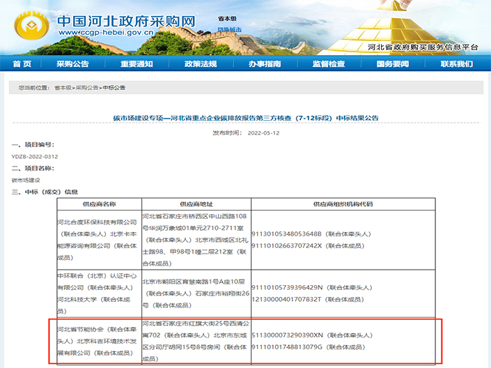 2022年5月12日,河北省政府采購網(wǎng)公布了“碳市場建設(shè)專項(xiàng)—河北省重點(diǎn)企業(yè)碳排放報(bào)告第三方核查(7-12標(biāo)段)”中標(biāo)結(jié)果公告,科吉與河北省節(jié)能協(xié)會(huì)組建的聯(lián)合體成功中標(biāo)。 科吉是國內(nèi)最早從事重點(diǎn)排放單位碳排放核查...